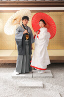 色鮮やかな色打掛と白の和傘で和装らしい落ち着いた印象に^^