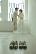 椅子を並べておしゃれショット。お二人の洋装の衣装もとってもお似合いです。