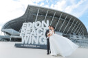 新郎様の肩に新婦様が乗ったかわいいショット。新婦様のアイシャドウのキラキラ可愛い。