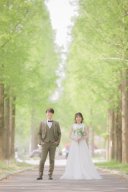 おふたりの振り返りショット☆グリーンと梅の背景が綺麗ですね
