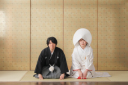 手にブーケを持つ新郎様。奥には遠くを見つめる新婦様も。