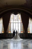 洋装ハウススタジオでの撮影スタートです!まずはきっちりとした立ち姿から^^ベールやグローブ、ブーケも色々なデザインの物をご用意しております。