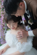 華やかなフラワーウォールの背景に、真っ白な白無垢が映えます。寄り添ってにっこり微笑んだお二人の幸せが伝わる1枚です。