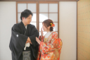 和装の裾や手元を整えたフォーマルな立ち姿。お堅い感じがしないのは、お二人の表情の効果ですね!