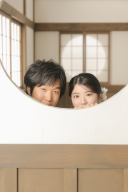 白いボックスに背中合わせで座っていただきました。少し俯瞰気味のショット。
