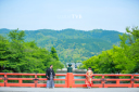 まるで夏の青空の下、ピシッと決めてフォトウェディング。朱色の橋が京都らしさを演出しています。