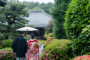 その門の前では、仲睦まじく手をつなぎ、優しい夕日に包まれたお二人の姿がとても印象的です