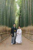 竹林から降り注ぐ光が優しくお二人を照らすフォトウェディングです。番傘もいい感じです。