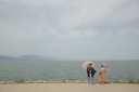 仲良く手を繋いで、歩いていくお二人。緑と朱色がよく映えますね!