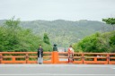 奥の山と門と紅白の傘が二人をより引き立たせています