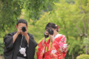 見つめ合うおふたり。幸せそうなおふたりを八坂の塔が優しく見守ってくれています。