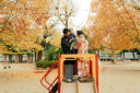 木漏れ日が綺麗な階段で。前後に立っていただいて奥行き感のあるショットを。