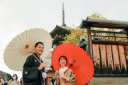 ご新郎様のエスコートで歩いているシーン。仲良く和傘を差して歩いていただきました!