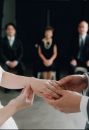 夕暮れに染まる空の下、手を取り合って見つめ合うおふたり。とても綺麗です!