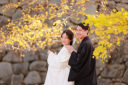 桜の中を散策するおふたり。ご新婦様を見るご新郎様の表情が緩みますね。