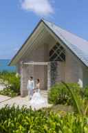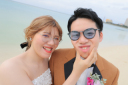 お次はアラハビーチでの撮影です。青い空、緑がきれいな木、お二人ととてもきれいなお写真です。