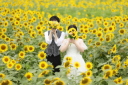 一面百合の花のなっているセットで撮影。ブルーのドレスとホワイトの花は相性が良いですね!