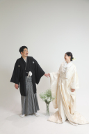 先ほどとは雰囲気をガラッと変え白無垢と黒の紋付に白と黒の背景でご撮影!おふたりともナイスポージング!