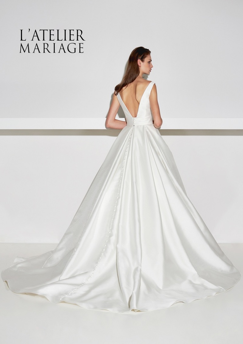 王道ミニマルなAラインスタイル。クラシックなボートネックと開いた背中のカッティングがポイント。クラシックな装いにも変化するモダン大柄レースの背中あてと長袖で3WAYの着こなしが叶う1着。