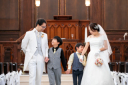 おふたりで手をつないでバージンロードを歩いている可愛らしいショット。向かい合って見せる自然な表情が、おふたりらしさを表現する素敵な一枚に仕上がりました。