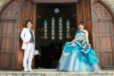お次は水色のカラードレスにお色直しして、館内ロケ-ションへ。チャペルでの王道フォトウェディングとは雰囲気の変わった、可愛らしいお写真の数々をご紹介いたします。