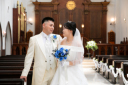 ご新婦様のソロショット。光の差す祭壇前でのお写真は、ウェディングドレスの白さがとても美しく写ります。グリーンを基調としたブーケだとナチュラルで落ち着いた印象に。