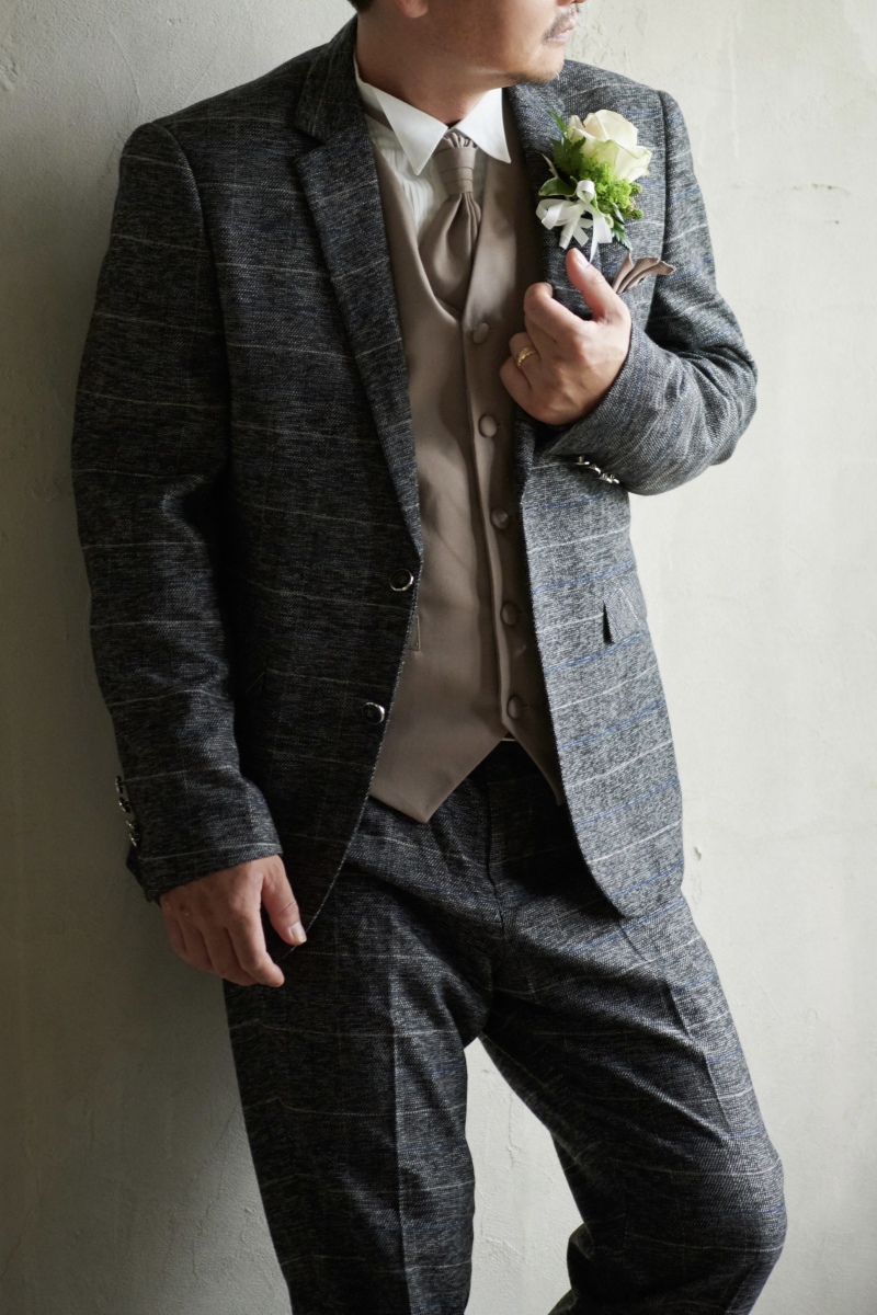 白やブルーのラインが入った、グレーのチェック柄タキシード。かっちりしすぎないので、カジュアルで楽しいフォトウェディングをお考えの方に合います。※写真は一例です。お好みのコーディネートでご着用いただけます。