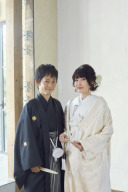お二人とも和装がばっちりきまってますね!新郎は白または黒のお着物からお選びいただきます♪新婦は白無垢のご用意もありますよ♪