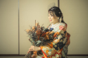 ゆるふわにまとめたヘアには、ドライフラワーを。和装とも相性ばっちり!