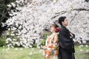 迫力あるイチョウの木の下で、和傘を差して見つめ合うお二人。ロケ地無限大だからこそ出会える、特別な色彩を活かして撮影しました。