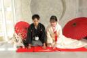 ハート型とスクエアのサングラスで遊び心をプラス。背中合わせで腕を組むポーズも、お二人ならこんなにスタイリッシュに決まる、お気に入りの一枚です。