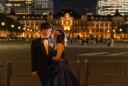 歴史的建造物である東京駅の駅舎の夜景をバックに満面の笑顔。お二人が大都会の夜の主役です。