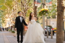 ライトアップが始まった丸の内の街並みを、軽やかに歩くご新郎ご新婦様。笑顔が輝き、とても楽しそうです。