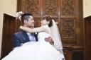 三重塔が望める橋の上で、ご新郎様とご新婦様が寄り添って歩く姿。これからの幸せな未来が目に浮かぶようです。