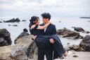 海と岩場という雄大なロケーションで、風に美しく舞うドレス。ブーケを中央に、向き合うお二人の真剣な眼差しが印象的な前撮りとなりました。