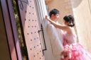 アンティーク調の扉の前で撮影。ウェデイングドレスの白色が映えますね♪