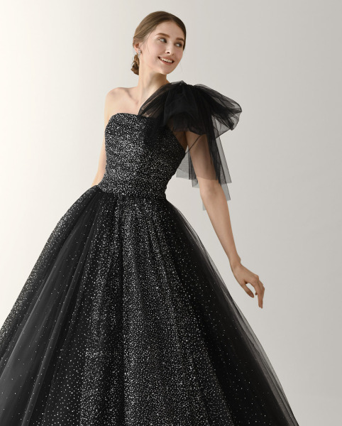 華やかなグリッターチュールで仕立てた、トレンドのブラックドレス。グレーの生地を忍ばせ、繊細で透明感のある印象に仕上げました。ボリュームのあるワンショルダーは、デコルテラインを魅力的に引き立たせ、甘すぎないエレガントな大人な1着に。