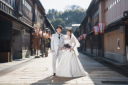最初は観光客が少ないうちに、ひがし茶屋街の撮影から。今日の打掛は、桂由美先生の打掛です。ブランド物でも衣装の追加料金が無いので、楽しんで選べます。