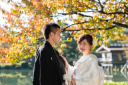 桜の樹でしょうか、綺麗に色づいていましたので眺めながらの撮影です。新婦様の笑顔が可愛いですね。
