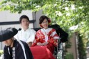 朝日を浴びるひがし茶屋街の町並みに金糸の豪華な打掛を装う新婦が浮かび上がります。