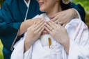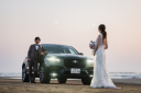 ロケーションの中でぎゅっと寄り添いながら口元は扇子で隠して撮影。この扇子は新婦様の胸元にささっている扇子を使いました。