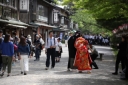 梅の橋と浅野川ベリでの撮影ですが、6月は緑が綺麗な季節ですね。赤い打掛がはえます!