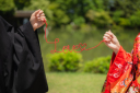 新郎様のソロ撮影ですが、新婦様も赤い傘をもってソロ撮影しました。背景の緑と新郎様の白の羽織り、ベストマッチです。