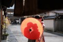 和傘をもってソロ撮影をしています。メイン通りは賑やかだったので少し横から撮影しています