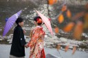 曲水に架けられた橋を渡って頂きました。離れたところから撮っているので声も届きません。お二人が進んでいくのを撮っていました。