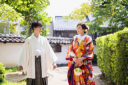 新婦様が新郎様に寄り添う感じでポーズをしていただき、和傘を横に置いて撮影しました。ここは、必ず2人だけのお写真になります。