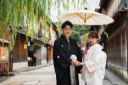 和傘を使ってのポーズは色々ですが、新婦様が和傘を開きかけ、新郎様は肩にのせて。素敵ですね!