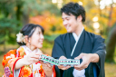 紅葉シーズン真っ只中の兼六園にて、扇子を広げて楽しそうに振り返るお二人の笑顔撮影させていただきました。
