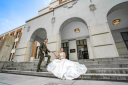 対面するご新郎新婦様。路地裏のしっとりした雰囲気がとても風情を感じさせます。