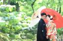 兼六園内の緑が綺麗なエリアにて番傘をお持ちいただきました。